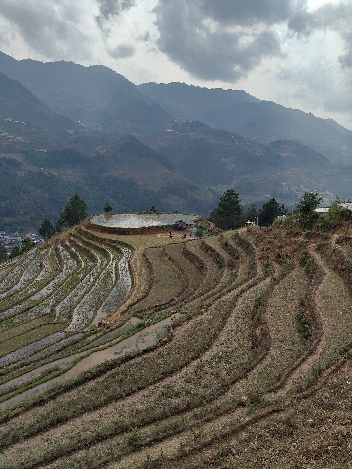 This image depicts a panoramic view of terraced rice fields in Mù Cang Chải, Vietnam, under a cloudy sky. The foreground and midground are dominated by numerous, curvilinear rice terraces carved into a steep hillside. Many terraces in the lower-left half are filled with water, reflecting the overcast sky, while others in the mid-right appear dry with bare soil or sparse vegetation. At a prominent elevated plateau in the midground, a large, circular, water-filled reservoir is visible. Adjacent to this reservoir stands a small, rustic, single-story wooden shack with a dark roof. A dirt path winds across this plateau; two motorcycles are parked on this path near the shack. Two human figures are present near the parked motorcycles, one appearing to wear a dark top and light pants. Scattered pine trees are also present on this elevated section of land. In a water-filled terrace below the plateau, a single dark animal, possibly a water buffalo, stands. The background features multiple layers of mountains extending into the distance, exhibiting varying shades of blue and green due to atmospheric haze. These mountains are covered in dense foliage, with some visible signs of additional terraced cultivation on their slopes. A small cluster of buildings, indicative of a village or town, is visible in the valley below the terraced fields on the far left. The sky is largely overcast with prominent grey clouds.