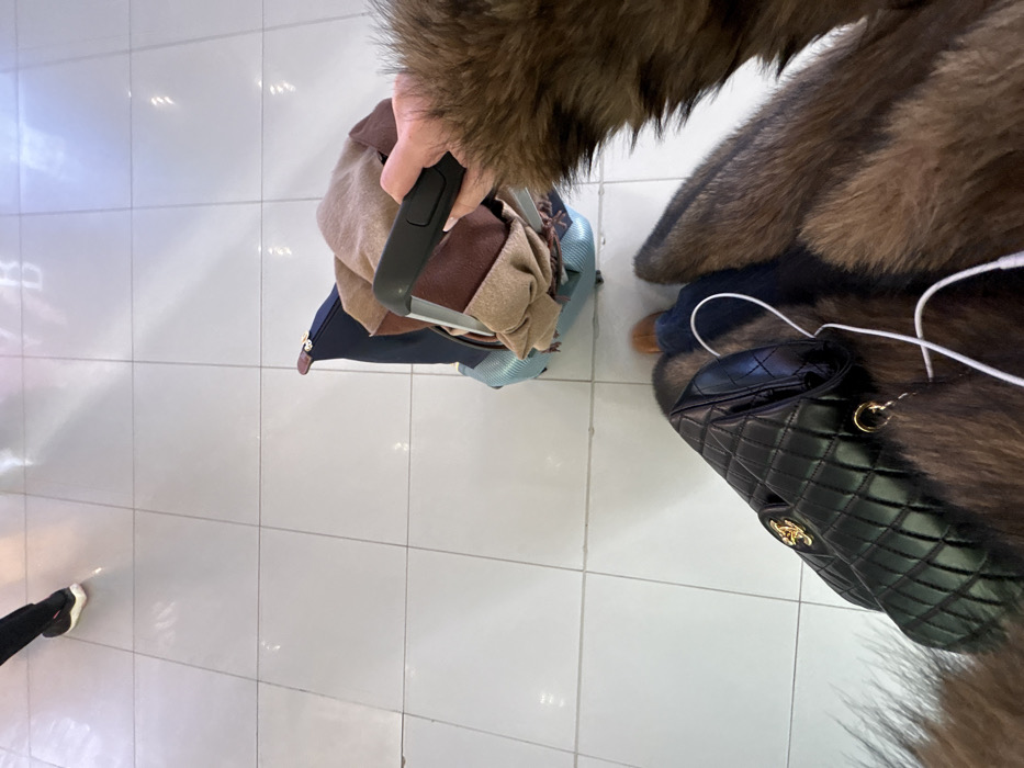 An overhead shot depicts a person in a fur coat on a tiled floor. The person is holding a rolling suitcase with various colored items stacked on top. A black quilted Chanel handbag with gold hardware is visible near the fur coat. Part of a foot in a black shoe with white trim can be seen in the lower left corner.