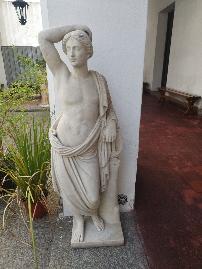 A full-length, classical marble statue stands outside against a white wall. The figure is female, draped in fabric, with one arm raised above her head. To the left, a potted plant with tall, thin leaves adds a touch of greenery. A dark passageway with a wooden bench is visible in the background on the right. The ground is paved with both stone and dark tiles. A lantern hangs from the building above.
