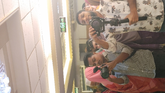 The image depicts an indoor scene within a commercial or event hall, location Unknown, Unknown. Two male individuals in the foreground are operating cameras amidst a gathering. The male on the left, wearing a white and black striped button-down shirt, holds a black mirrorless or DSLR camera with an attached flash unit, aiming it forward. The male on the right, wearing a white floral-patterned shirt, holds a black mirrorless camera mounted on a handheld gimbal stabilizer, pointing it towards himself, indicating a selfie or point-of-view shot. In the mid-ground and background, several other individuals are partially visible, including a person in a white topi and pink garment, a female with sunglasses on her head, and another female with a wide smile. The ceiling features a grid of white acoustic tiles and recessed lighting, with a partial view of a chandelier in the top-left. A green "EXIT" sign with a white running figure and right arrow pictogram is visible on a light-colored wall in the background, above an air conditioning vent. The scene suggests an event or social gathering being documented.