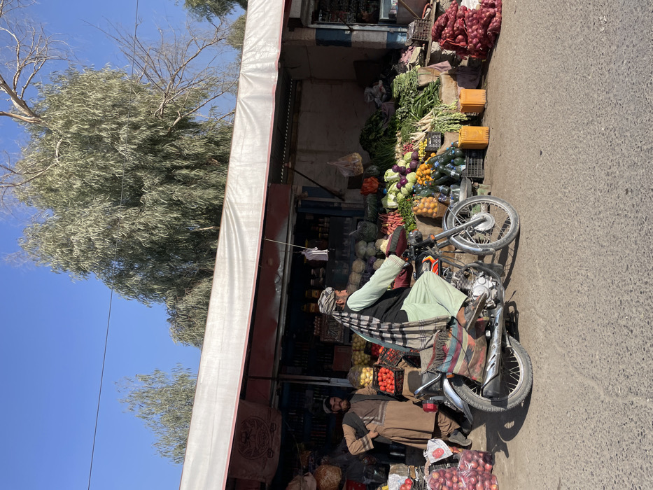 A produce stand sits roadside under a white awning. Vegetables like onions, tomatoes, cabbage, zucchini, and carrots fill shelves. A man reclines on a parked motorcycle in front, wearing traditional clothing and a turban. Another man stands nearby in a brown garment. A large tree with silvery-green foliage looms over the stand, set against a clear blue sky.