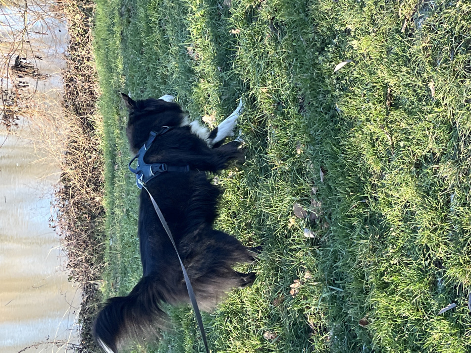 A black and white domestic dog, consistent with a Border Collie breed, is observed in profile, moving from left to right across a sunlit grassy area. The dog exhibits predominantly black fur with white markings on its chest, forelegs, and facial muzzle, and possesses a long, bushy black tail. It is fitted with a dark, multi-strap harness, from which a dark leash extends forward and out of the frame to the left, indicating an unseen handler. The dog's posture suggests forward movement, with its right foreleg lifted. The immediate ground is covered in dense, vibrant green grass interspersed with scattered brown fallen leaves. In the background, a body of calm water is visible, reflecting ambient light. Beyond the water, a dense mass of bare, brown deciduous branches and shrubbery forms a natural border. The scene is illuminated by direct sunlight, casting highlights on the dog and the vegetation. The specific location within Andrézieux-Bouthéon, France, cannot be determined from the image, but the environment aligns with a natural outdoor setting, such as a park or riverbank.