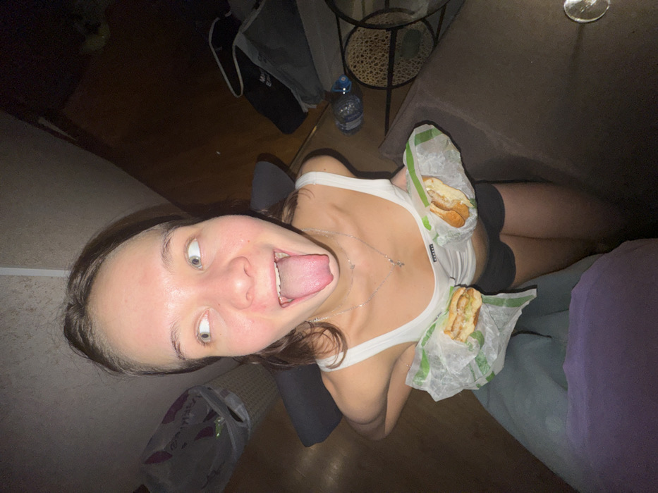 A woman wearing a white tank top holds two sandwiches in wrappers. She has her mouth open, tongue sticking out, and eyes wide. She is sitting on a grey chair, and there is a brown wooden floor beneath her. A water bottle and table are visible in the background, along with a trash can and couch. The lighting is dim.