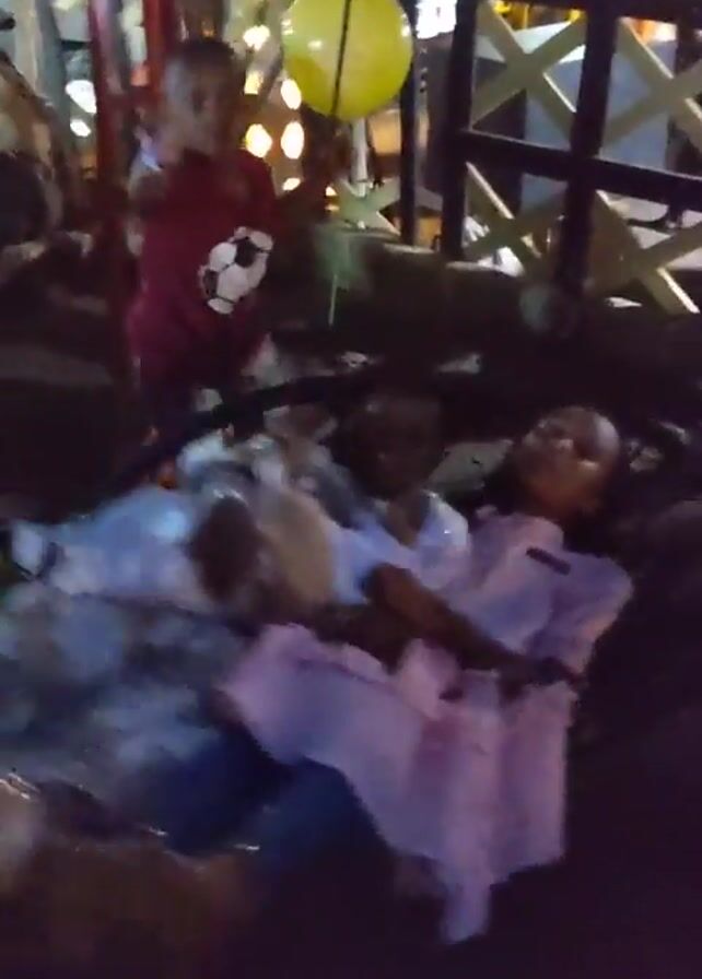 children playing in an outdoor area at night. There is a yellow balloon visible. The area seems to be a playground or a party venue, evidenced by the presence of people, fencing, and music in the background. Some children are seated on what appears to be a swing-like structure fashioned from tires and a blanket. Another child stands nearby. The scene is darkly lit, and some details are not sharp. There are cars and buildings visible in the background behind the play area.