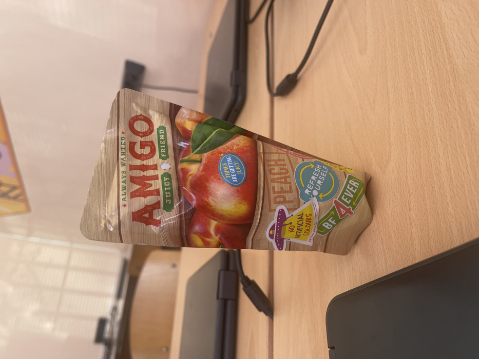 The image displays an indoor scene, likely a classroom or study area, within the city of Pravets, Bulgaria, though no specific landmarks are visible to pinpoint the exact location. A triangular-shaped Amigo brand peach juice pouch, predominantly beige with a wood-grain texture and featuring images of peaches, stands upright on a light-colored wooden desk surface in the foreground, slightly right of center. The pouch displays text including "ALWAYS WANTED," "AMIGO," "JUICY FRIEND," "THINGS ARE GETTING JUICY!", "PEACH," "NO ARTIFICIAL COLOURS" (accompanied by a UFO icon), "REFRESH YOURSELF" (with a circular arrow icon), and "BF 4 EVER." To the left of the pouch, a partially visible closed black electronic device, resembling a laptop or tablet, rests on the desk, connected to a black charging cable. Another similar black electronic device is blurred in the background on the right side of the desk. The background consists of a light-colored wall or partition, with a blurred orange object or poster visible high on the wall. A blurred wooden chair back and what appears to be a window or blinds are indistinctly visible in the upper-left background. No individuals are present, and no actions or interactions are depicted.