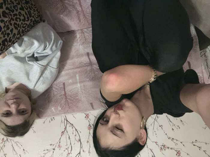 Two females are depicted seated on a sofa within an indoor residential setting. The specific city of Lanchkhuti, Georgia, cannot be determined from the visual information presented. The female on the left has dark hair, is wearing a black short-sleeved top and black leggings. She wears gold hoop earrings and multiple gold-colored bracelets on her left wrist. Her right eye is closed in a wink, and her lips are pursed. Her left arm is extended forward, holding the camera, indicating she is taking a self-portrait. Her right arm is bent at the elbow. The female on the right has light-colored hair and is wearing a light gray long-sleeved sweatshirt and leopard print pants. She is seated next to the first female, looking directly towards the camera with a neutral expression. The sofa is covered with a light pink fabric featuring a repeating pattern of stylized bare trees in white and brown/pink. The wall behind the subjects is covered with wallpaper patterned with cherry blossom branches, displaying pink flowers and brown stems on a light background. The scene is illuminated by interior artificial lighting.