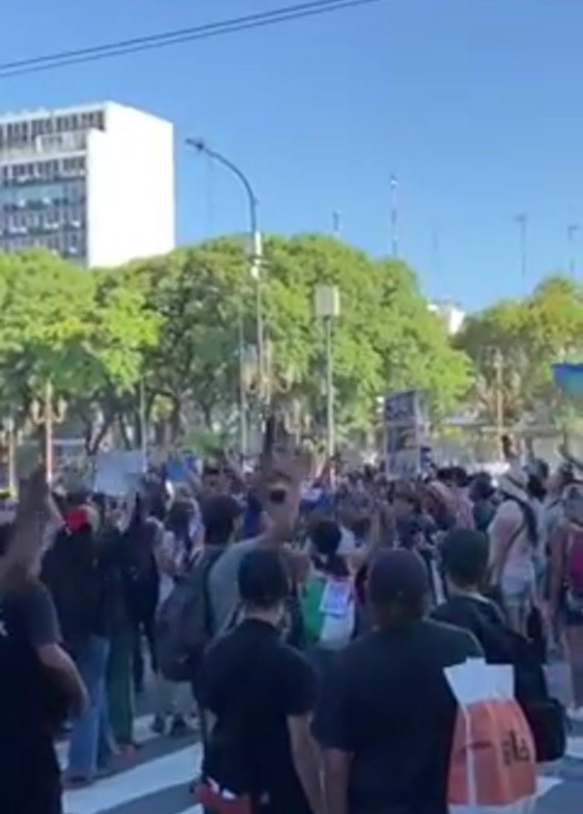 crowd of people gathered on a city street. The majority of the people are walking in the same direction. Many are holding signs, and flags can be seen amidst the crowd. The crowd appears to be crossing an intersection, and is surrounded by city buildings and trees. The sky is clear and blue.
