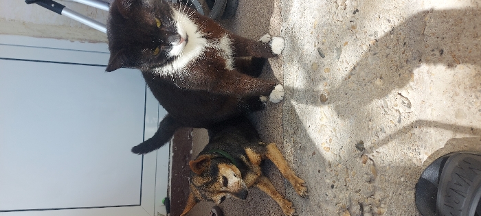 The image displays a small, mottled brown and black dog with a green collar, lying on a concrete surface, positioned to the left. Adjacent to the dog, a black and white tuxedo cat with yellow-green eyes stands upright, facing slightly right. This outdoor scene is located in Razgrad, Bulgaria. The dog rests with its front paws extended, eyes appearing partially closed. The cat exhibits white fur on its chest, muzzle, and paws, with its tail raised vertically. The background to the left features a white door or window frame. To the right, a light-colored wall is visible, along with a vertical silver metallic object and a partial view of a dark, circular object. The concrete ground contains visible aggregate and is illuminated by direct sunlight, casting shadows from both animals and a partial view of a dark object, likely a shoe or foot, in the lower left corner.