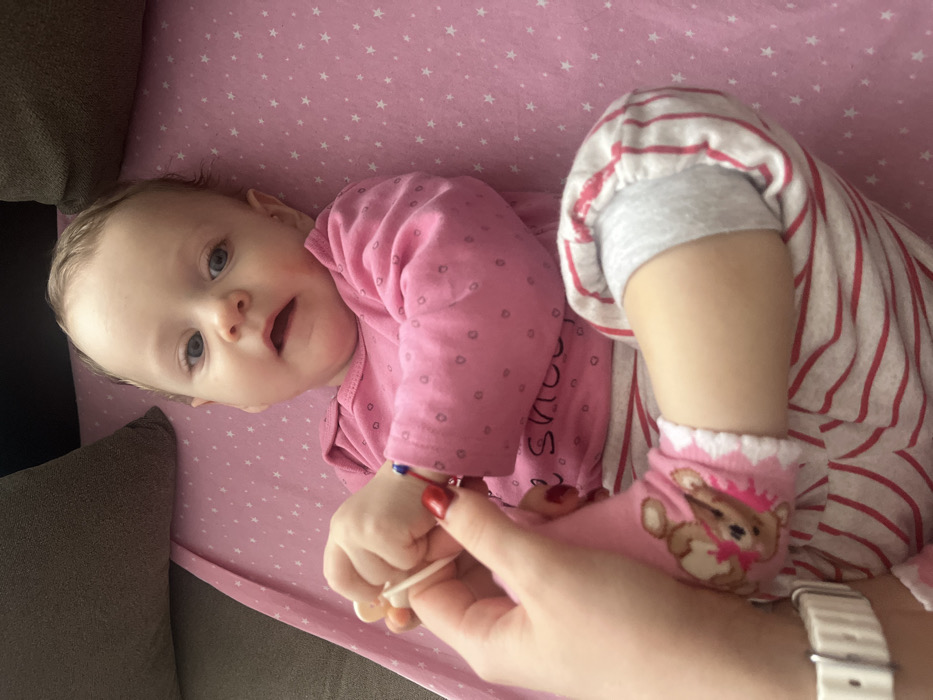 An indoor scene depicts an infant lying on a pink surface patterned with white stars. The infant possesses light brown hair and blue eyes, looking directly towards the camera with a slightly open mouth. The infant is clad in a long-sleeved pink top with small heart-shaped patterns and white trousers featuring red stripes, with gray cuffs at the ankles. A pink sock with a brown bear design is visible on the infant's left foot. A red string bracelet with blue beads is present on the infant's left wrist. A female's left hand, exhibiting red nail polish and wearing a white ribbed watch, holds the infant's left foot. The infant's right hand holds a small, light-colored object, possibly a teether. Dark brown soft furniture, likely cushions, is partially visible in the upper background, indicating a bed or sofa setting. The specific geographic location within Mytishchi, Russia, is not discernible from the visual information presented in the image.