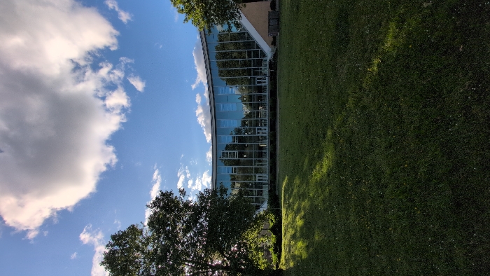 large, modern building with a curved facade and many windows, primarily glass, set against a bright blue sky with a few large white clouds. The building appears to be made of concrete and glass. The building is situated on a large, grassy lawn. The building is located in Wuppertal, Germany, at latitude: 51.253, longitude: 7.141, near the Wuppertal Zoo. The surrounding trees are mostly deciduous, with some evergreen trees. The building is located on a slight incline, and the lawn slopes down in front of the building. The trees in front of the building are casting shadows on the lawn. There are no people or animals visible in the image.