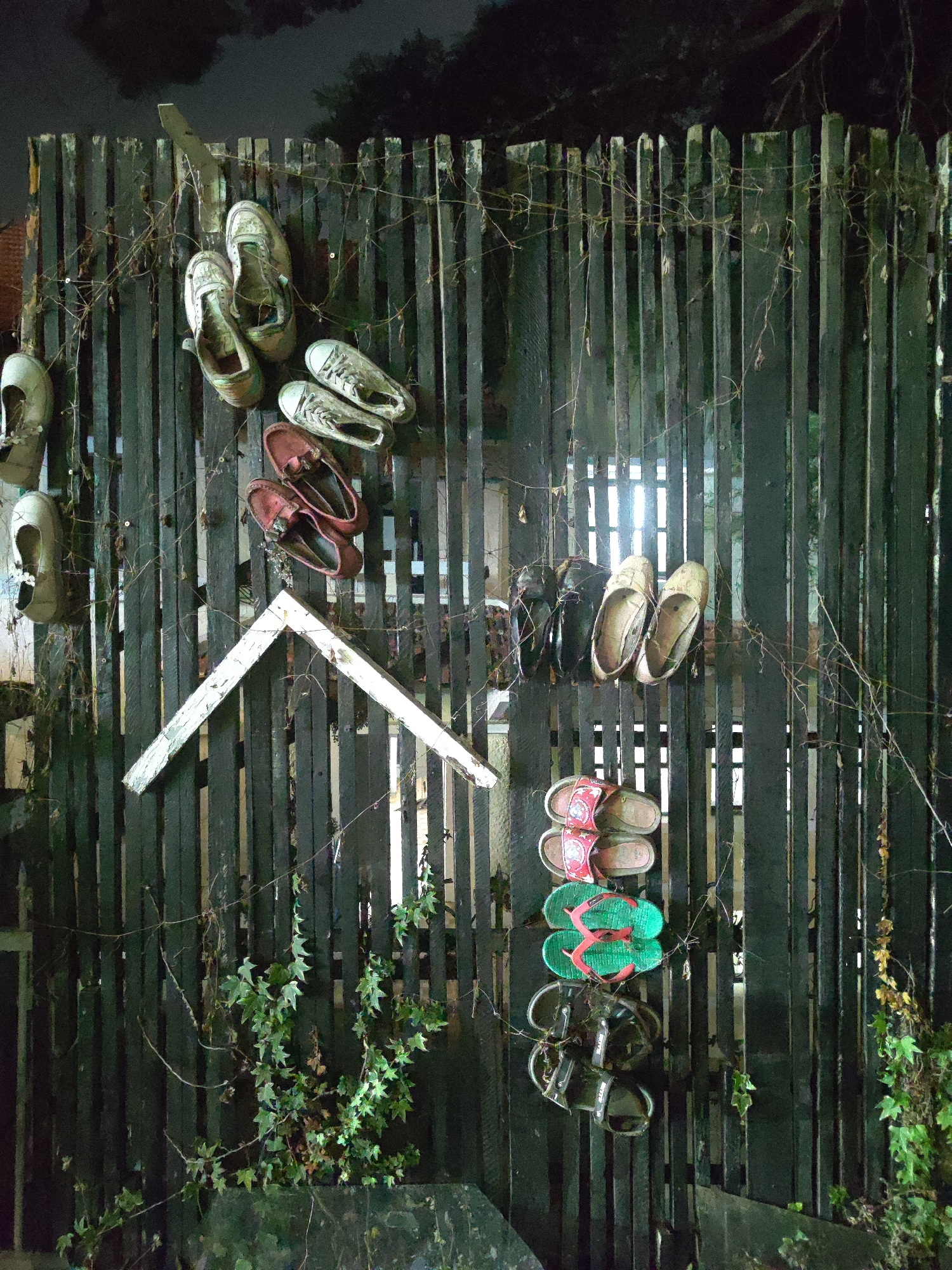 A vertical shot depicts a section of a weathered, dark-stained wooden fence, seemingly outdoors, with assorted footwear hung upon it. The fence is made of closely-spaced, vertical planks, showing signs of age and wear. Climbing plants and dry vines intertwine with the planks, adding to the rustic appearance. A small white, triangular structure, possibly part of a birdhouse or decorative element, is affixed to the fence. From top to bottom and left to right, an assortment of shoes and sandals hang from the fence: -A pair of dirty white sneakers are on the upper left. -Slightly down from them is a pair of white tennis shoes. -Below the tennis shoes is a pair of burgundy women's slip-on shoes. -Further down and to the right is a pair of dirty tan shoes -Below those are stacked on top of each other: a pair of red and beige flip-flops, a pair of green and dark green flip-flops, and a pair of black and beige sandals. The setting seems to be outdoors at night, as indicated by the ambient light and the presence of trees and foliage in the background. Due to the style, the location of the image, being taken from Da Lat, Vietnam, it may be assumed this is likely a personal yard, perhaps a rural one.