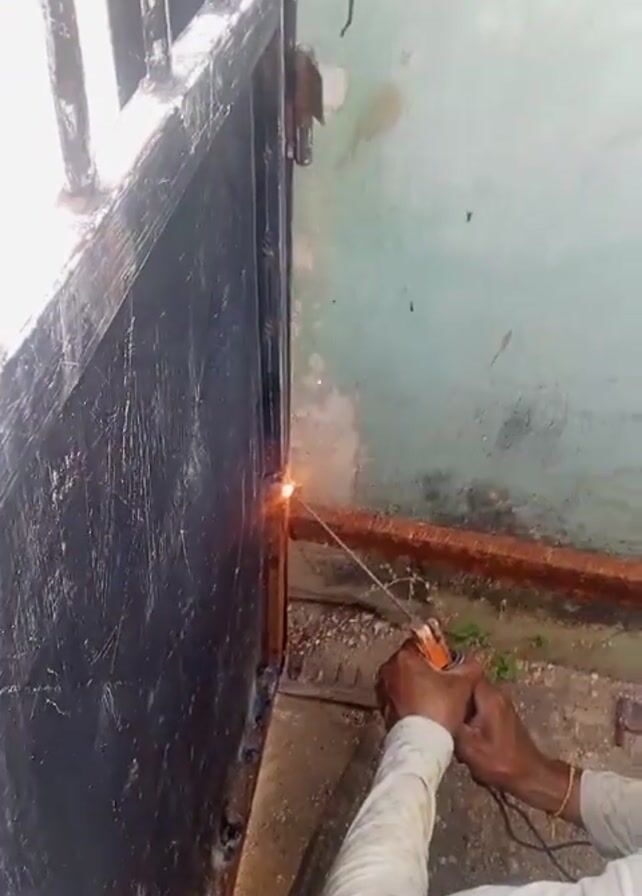 A person wearing long sleeves is welding a metal gate. The gate is black and has vertical bars. The welder is using an orange welding gun and sparks are flying as they work. The gate is next to a light blue wall.