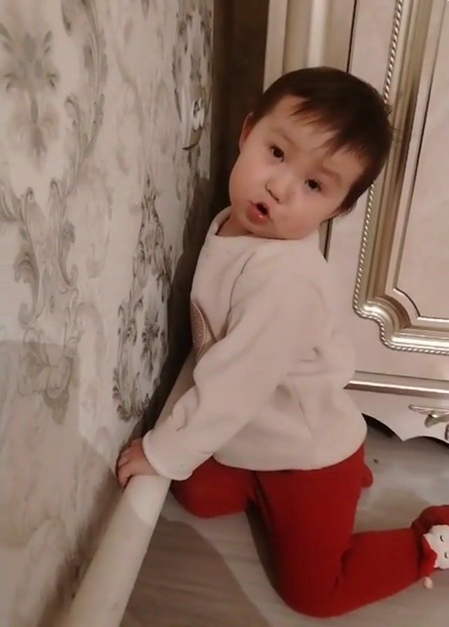 A toddler is kneeling on the floor, leaning against a wall. The wall is covered in wallpaper with a floral pattern. The toddler is wearing a white long-sleeved shirt with a smiley face and red leggings. They have dark hair. The toddler looks up at the camera, makes a surprised or questioning face, and then smiles, reaching out with their hand. A piece of furniture, like a cabinet, with a silver framed door is visible to the right. A white rug is on the floor.