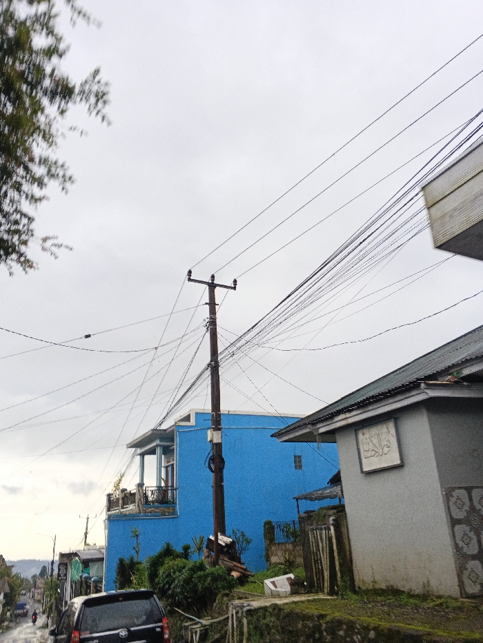 The image depicts an urban residential street scene in Sindangjaya, Indonesia, under a uniformly overcast sky. A prominent brown wooden utility pole stands in the center-midground, heavily burdened with a complex network of numerous black overhead electrical and communication cables that crisscross the frame. To the left of the utility pole, a two-story building painted bright blue features a second-floor balcony with a dark railing. To the right, a single-story building with light grey walls and a dark green corrugated metal roof is partially visible. A rectangular relief carving, displaying script consistent with Arabic calligraphy, is affixed to its exterior wall. In the lower left quadrant, the rear section of a dark-colored SUV is partially visible on what appears to be a wet asphalt road surface. Further down the street on the left, additional residential structures and indistinct smaller vehicles are present along a sloping incline. Green foliage from a tree is blurred in the upper left corner, and shrubs are visible in front of the blue building. A moss-covered concrete retaining wall occupies the immediate lower foreground, with minor debris scattered near the base of the utility pole. No clearly identifiable individuals are present.