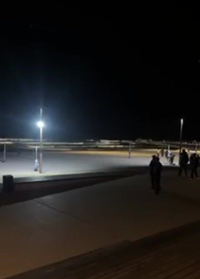 At night, the scene depicts a beach from an elevated perspective, with wooden stairs in the foreground and a concrete walkway leading toward the beach. Streetlights illuminate the beach, where waves can be seen. Several figures are walking along the walkway. Beach volleyball nets are visible on the sand.
