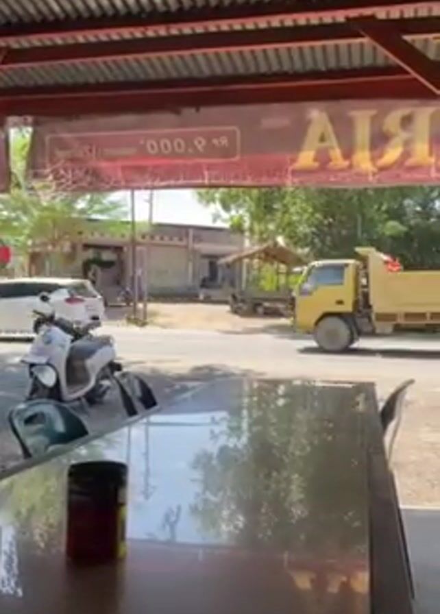 From under a corrugated metal roof, a view of a road unfolds. Across the road, simple buildings stand, interspersed with trees and foliage. A white minivan and a yellow dump truck travel along the road. In the foreground, a reflective table sits inside a shaded area, a black and red container resting on its surface. A couple of scooters are parked nearby. Above the road, a red and white sign hangs, reading "RIA."