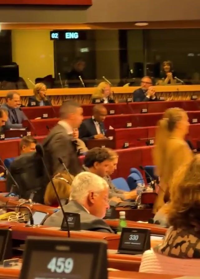 The camera pans across a room filled with people seated in rows, reminiscent of a legislative or parliamentary setting