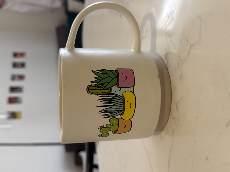A white mug with a large handle sits on a light-colored marble surface. The mug features a stack of three cartoon cacti in pots. The top pot is pink, the middle is yellow, and the bottom is orange. Each pot has a simple smiley face. A white refrigerator is visible in the background with several magnets.