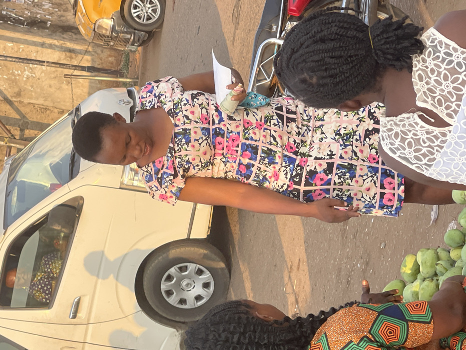 Three women stand beside a white van, seemingly engaged in a transaction. One woman wears a floral dress, holding a paper and money. Another is dressed in white lace. A third woman is wearing a patterned orange and blue shirt near a pile of green mangoes. A motorcycle is visible in the background behind the women.
