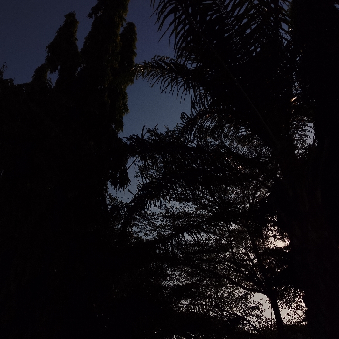 The image displays an outdoor scene at dusk or dawn in Narayi, Nigeria, characterized by silhouetted trees against a gradient sky. The sky transitions from a dark blue at the upper left to a lighter, possibly greyish-blue hue towards the bottom right, suggesting the direction of ambient light. On the left side of the frame, several tall, slender, dark coniferous-like trees extend vertically. The central and right portions of the image feature multiple other trees, also in silhouette, exhibiting denser canopies and some with discernible frond-like leaf structures. There are no individuals, animals, or man-made objects visible within the observable scene. No actions or interactions are depicted.