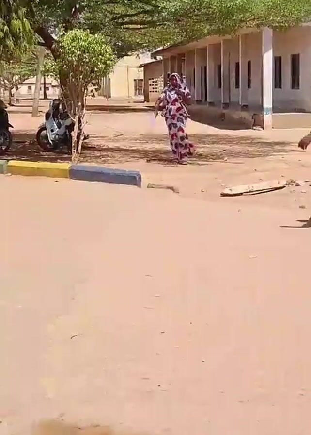 sunny outdoor scene on what appears to be a campus. The ground is mostly reddish-brown. There's a large tree on the left providing shade. In the background, there's a long, one-story white building with a series of windows. A man in a black outfit walks from right to left across the frame. A woman in a patterned dress and headscarf walks from the background towards the foreground, holding a white piece of paper in her hand. Two motorcycles are parked near the tree. In the foreground is cracked pavement.