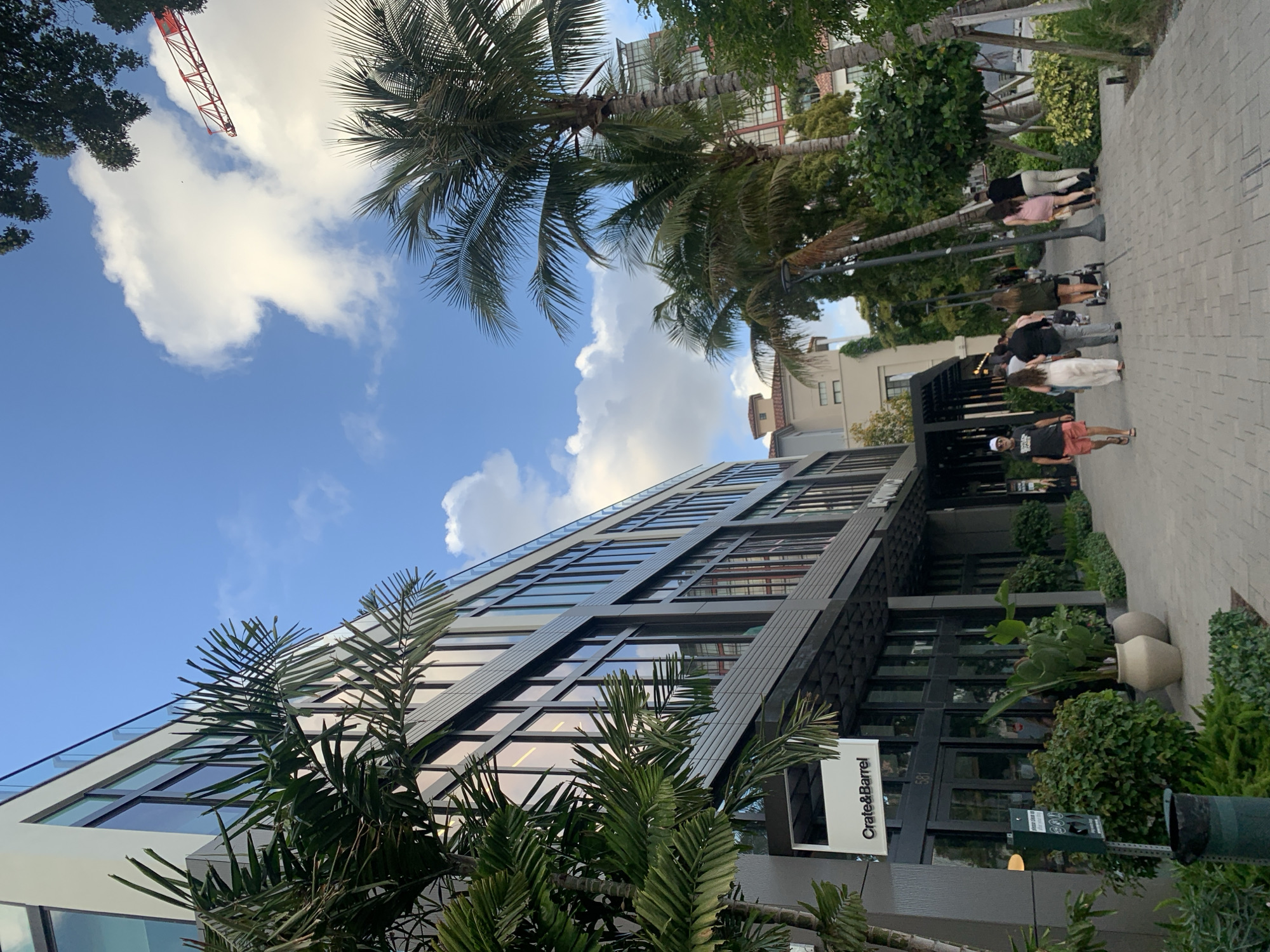 Crate and Barrel store in West Palm Beach, Florida. The modern building is constructed with numerous glass windows. A sidewalk runs adjacent to the building, with several pedestrians walking along it. Palm trees and other greenery are present in the foreground and background. Above the building, the sky is blue with scattered clouds. A red construction crane is visible in the upper left of the frame.