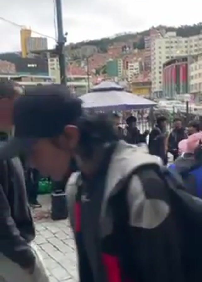 A group of about a dozen musicians are playing outdoors on a cobblestone surface in what appears to be a town square in Bolivia. They are playing traditional instruments, including panpipes, guitars, and drums. The musicians are dressed in a variety of clothing, including ponchos and traditional hats. People are walking past the musicians and some are dancing to the music, including one young girl and a woman in a blue coat. The background of the video shows a hillside covered in buildings, and the sky is overcast. There is a white car parked on the side of the road near the musicians.