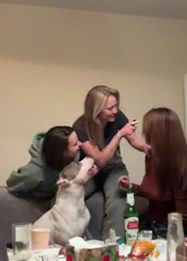 Three women are on a couch in an indoor space. There is a white and grey dog in front of the couch, near the women. A table in front of them holds various items, including beer bottles, tissues, a vape pen, and a plate. One woman is applying something to another woman's face. They are all smiling and laughing. The woman who was having something applied to her face wipes her face off. The woman who was applying the substance throws a green hoodie back to her friend on the couch. The dog puts its head in a tissue box and looks at the table.
