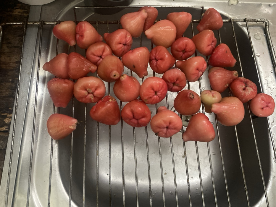 - "Approximately 45-50 reddish-pink, bell-shaped fruits, identified as wax apples (Syzygium samarangense), are observed resting on a stainless steel drying rack positioned within a stainless steel kitchen sink" by FM-8YXTB3, licensed under CC BY 4.0