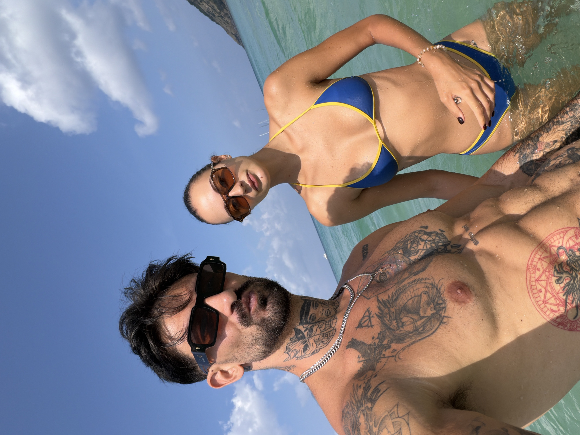 A man and a woman are posing in waist-deep water. The woman is wearing a blue bikini with yellow trim and brown sunglasses. The man is shirtless, wearing a silver chain necklace and dark sunglasses, and covered in tattoos on his chest and neck. The sky is blue with scattered white clouds. The location is near Rawai, Thailand.