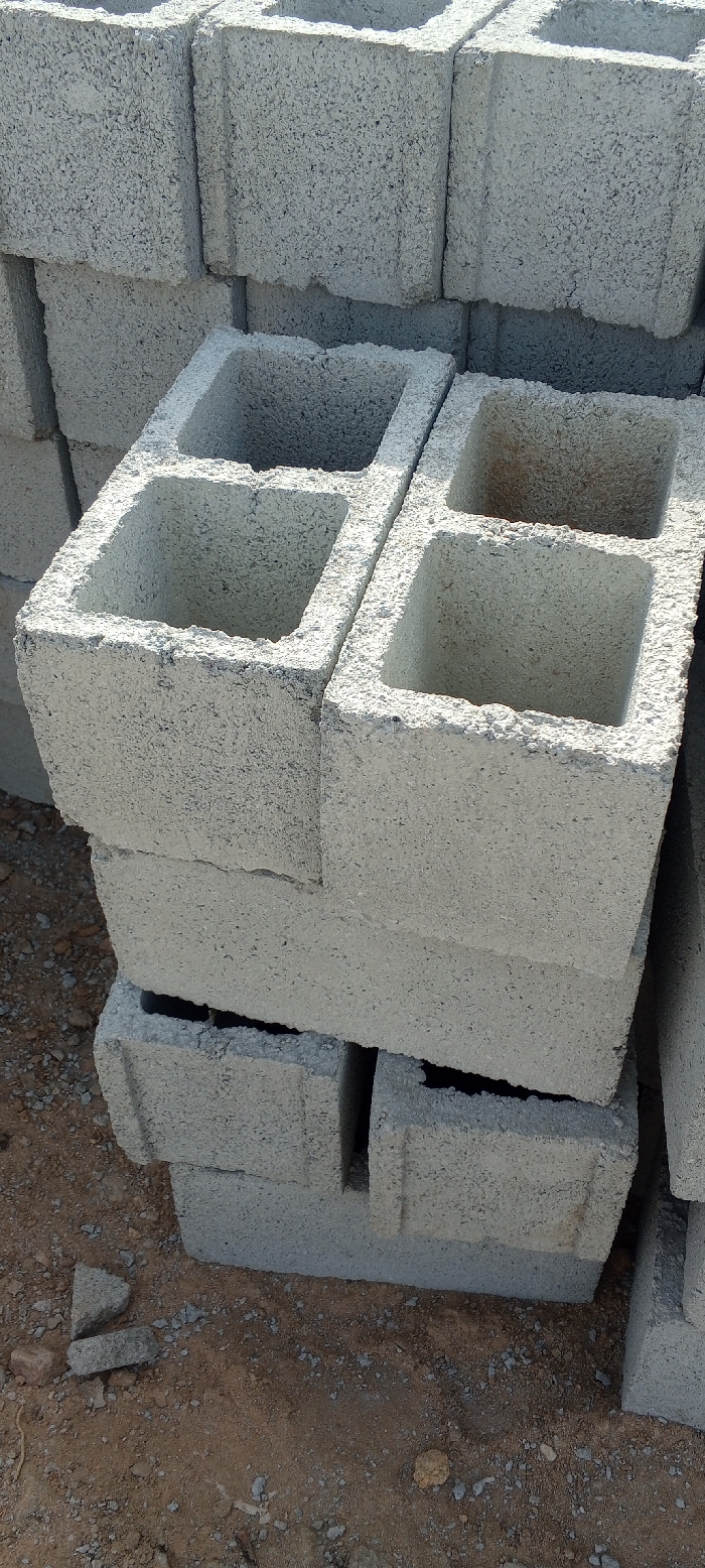 A stack of gray concrete blocks with two square holes each rests on reddish-brown soil and small gravel in Adankolo, Nigeria