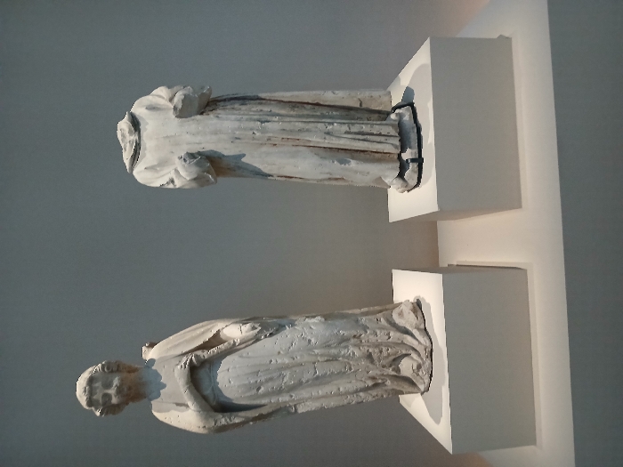 The image displays two light-colored, aged stone or plaster sculptures, exhibited within the Louvre-Lens museum in Lens, France. Both figures stand on individual white rectangular pedestals, which are positioned on a larger, light-toned display surface against a plain light grey wall. The sculpture on the left is a standing, full-figured individual, possibly female or an angel, with an intact head featuring wavy hair and discernible facial characteristics. The figure wears a long, draped garment and holds an indeterminate object, possibly a scroll or staff, against its chest with its right arm; the left arm extends downwards. The sculpture on the right is a headless torso, depicting a figure clad in a long, hooded monastic-style robe. Its arms are bent, with hands either missing or severely damaged. The lower section of this figure is secured to its pedestal by dark metal bands. Both sculptures exhibit signs of weathering and historical wear.