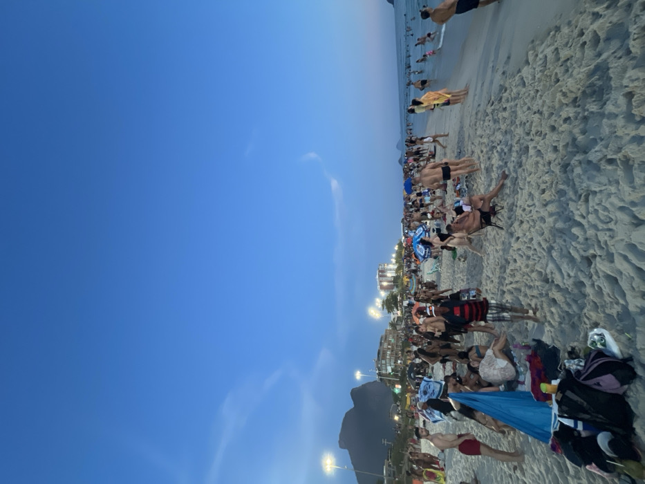A crowded beach scene under a clear blue sky. Many people are scattered on the sand, some sunbathing, others walking or standing near the water. Buildings and a mountain are visible in the background, along with street lights illuminating the area. The beach stretches into the distance, with more people visible along the shoreline.