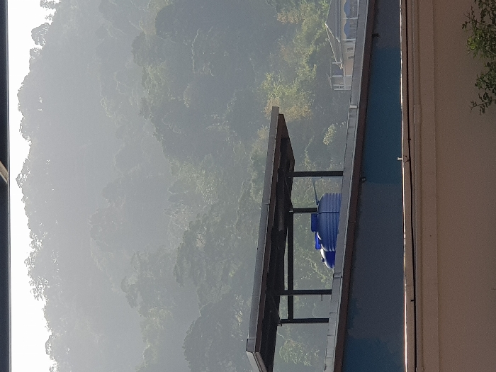 A blurred, mountainous landscape stretches into the distance under a hazy sky. In the foreground, a blue plastic water tank sits atop a metal frame on the edge of a building. The building's exterior is light-colored with a contrasting blue accent. A partial view of a neighboring building is visible to the right, and some greenery is present. The image appears to be taken from an elevated position.