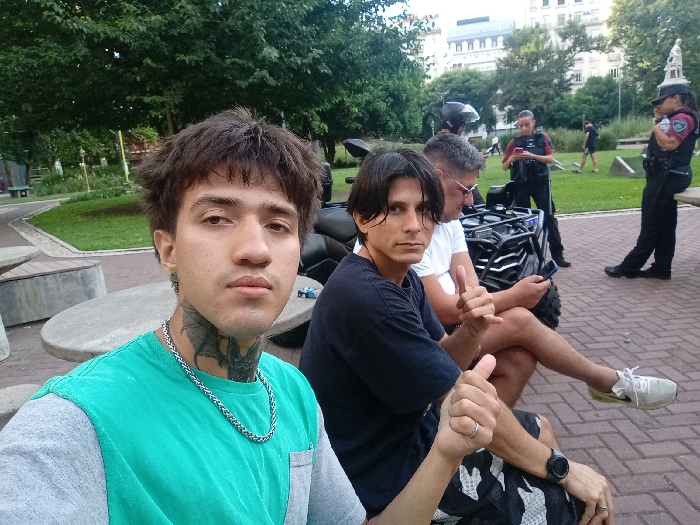 Three men are sitting on a stone bench. The man in the foreground, wearing a green and gray shirt, has a neck tattoo and a silver chain. The man behind him wears a black shirt, and the other, a white shirt. They are all giving a thumbs-up. Behind them, an ATV is parked. Two people in police uniforms are standing on a lawn in the background. Trees and buildings are visible in the background as well.