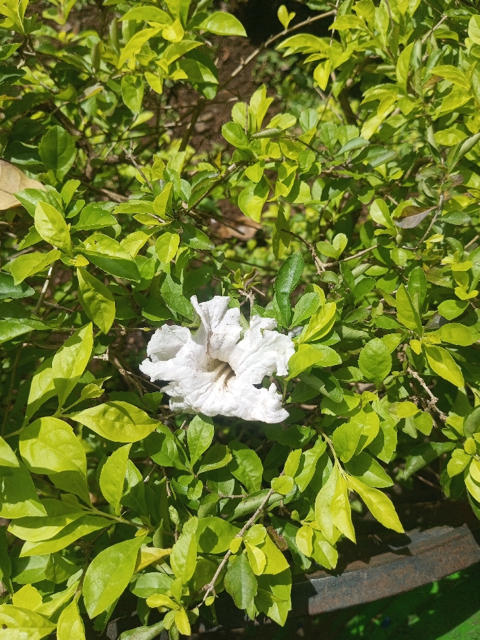 A bright, sunlit bush with vibrant green and yellow leaves surrounds a single, white flower. The flower is centrally located, appearing slightly wilted with ruffled petals. Brown branches intertwine amongst the dense foliage. The bottom right corner reveals a glimpse of a dark, possibly metallic or plastic, object. The overall impression is a close-up of a natural setting with a contrasting element of human presence.
