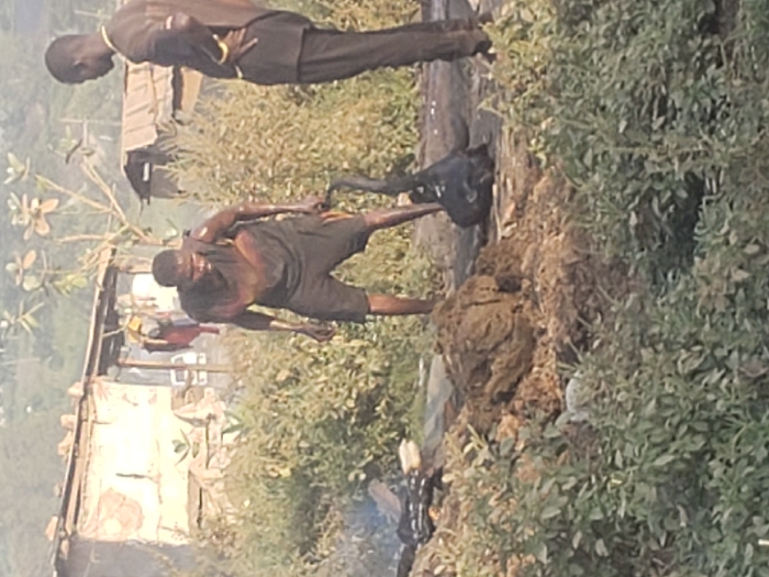 The image depicts an outdoor scene in Adonkolo, Nigeria. In the foreground-center, a large, irregular mound of dark brown, fibrous organic material is present on the ground. To the immediate right of this mound, a dark, charred animal carcass, consistent with a pig, lies horizontally. A dark-skinned adult male, estimated 30-40 years old, wearing a dark sleeveless shirt and dark shorts, is bent forward over this area. His skin and clothing are heavily soiled with a dark, reddish-brown substance. He holds a dark, elongated object in his right hand, appearing to be actively engaged in processing the animal or the fibrous material. To his right, a second dark-skinned adult male, wearing a dark short-sleeved top and dark trousers, stands upright with hands on hips, observing the first individual. In the background-left, a small smoldering fire with faint smoke is visible. Further in the background, several rudimentary structures, constructed from mixed materials including corrugated metal, are present, with clothing hanging outside one. The scene is characterized by dense green shrubbery and bushes across the foreground and mid-ground, with a distant hillside forming the horizon.