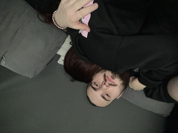 Two individuals are positioned on a bed or sofa in an indoor setting within the city of Yambol, Bulgaria. The primary subject, a male, is situated on the left, facing the camera with a neutral expression. He possesses a beard, mustache, dark hair, and a piercing above his left eyebrow. He wears a black long-sleeved garment, possibly a hoodie, with a faint light-colored detail on the chest. His left arm is bent, with his hand near his head, while his right arm extends around the second individual. The second individual, with dark red hair, is partially visible on the right and behind the male, with their head resting near his shoulder. They are also wearing a black long-sleeved garment, featuring a pink and white design on the front. The second individual's left hand, adorned with a red and white twisted bracelet, rests on the male's chest. The background features a plain dark gray wall. A light gray pillow supports the male's head, and a dark gray pillow with a subtle pattern is visible to the right, adjacent to the second individual. A white pillow is partially visible behind the second individual's head.