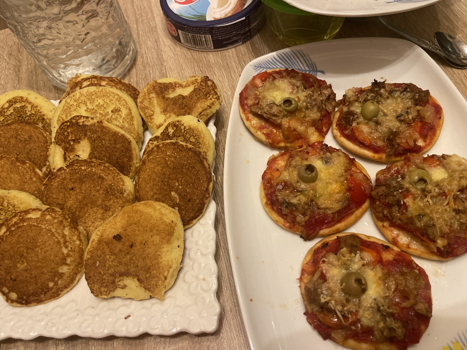 A wooden table holds two white plates. One plate contains many small, golden-brown pancakes stacked closely together. The other plate displays five mini pizzas, each topped with tomato sauce, cheese, and an olive. A glass of water and a container of spread are partially visible in the background. A spoon also appears near the plate of pizzas.