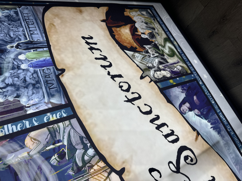 The image displays a close-up, angled view of a section of a large, vertically oriented printed graphic, likely a poster or display panel, set against a dark, out-of-focus background, possibly a floor or wall. The graphic features a collage of fantasy-themed illustrations and text. A prominent, light-brown, parchment-like scroll banner with a ragged edge runs diagonally across the mid-section of the visible graphic. On this scroll, the word "Sanctorum" is written in ornate, black script. Above the scroll, to the upper left, an illustration depicts armored knights in action. One knight, wearing full metallic-gray plate armor and a helmet, holds a weapon (possibly a spear) raised. A narrow, dark blue vertical strip separates this panel from another, containing partially visible white text reading "others eues." To the upper right of the scroll, another illustration shows a large, ornate stone monument or statue with detailed carvings of figures. In front of this monument, three robed figures stand with their backs to the viewer, facing the structure. They wear a blue cloak, a green cloak, and a black cloak, respectively. The base of the monument has carved text, with "IMAG" and "MIGHT" clearly visible. Below the scroll, to the lower left, an illustration features a person in a dark hooded cloak holding a glowing wand or staff. Behind them, a procession or army of shadowy figures advances through a misty environment. Below this panel, a horizontal strip of text against a dark background reads, in part, "INDE, ILLE SUM INEVITATATEM ACCIPIT ET IN IN VITA." To the lower right of the scroll, another illustration portrays a complex scene. A woman with dark, curly hair in a purple garment stands in the foreground, looking forward. Behind her and to her right, a group of people is depicted in an indoor setting with architectural details suggesting a gothic or medieval style. Some figures appear distressed. Above this group, a dark, reddish-brown sky with silhouettes of flying, bat-like creatures or dragons is visible. Below this panel, a horizontal strip of text against a dark background reads, in part, "PEIORA MORTE ESSE INTELLIGIT." The image provides no visual information to determine its specific location in Podolsk, Russia.