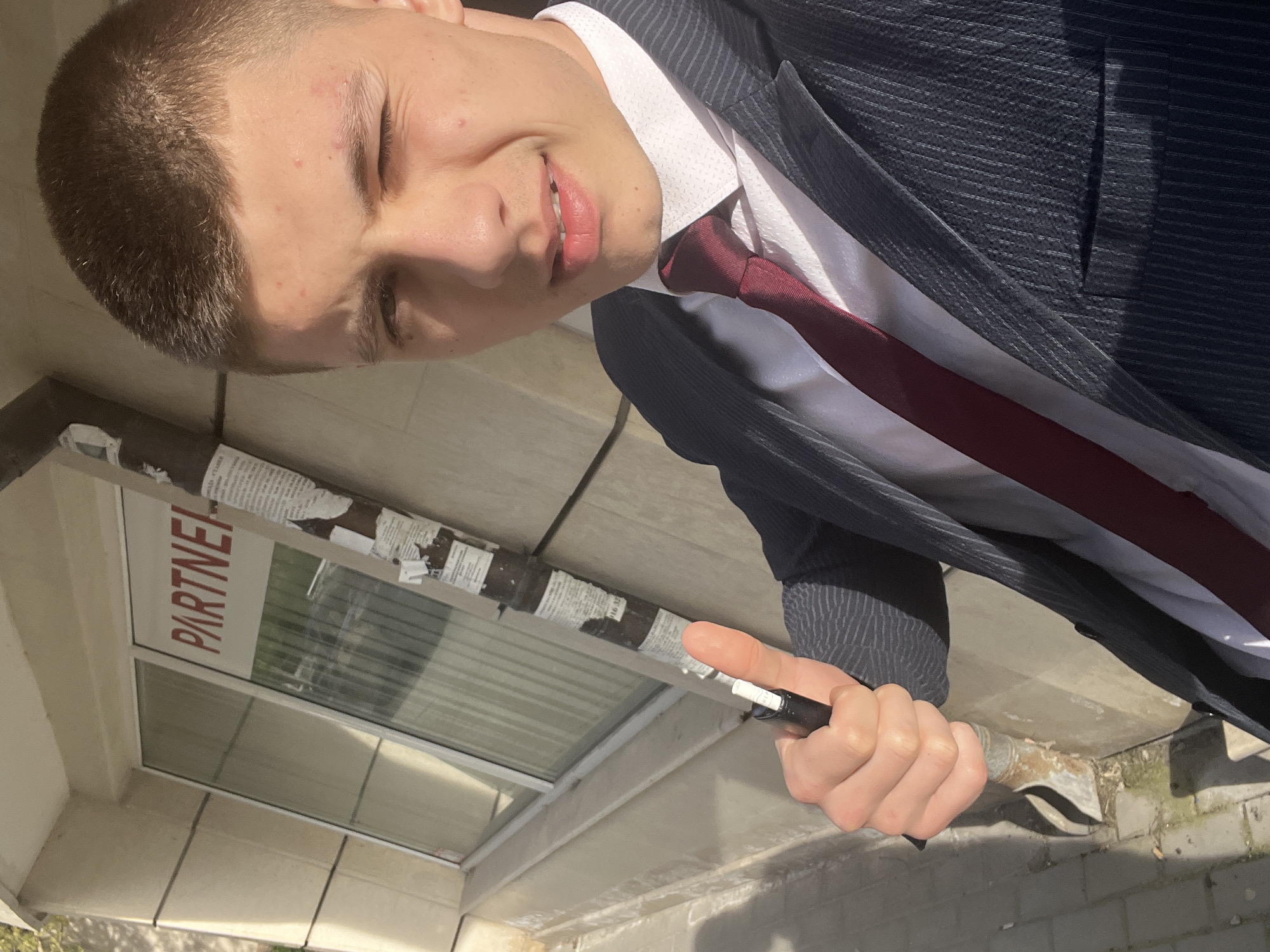 A young Caucasian male in a navy pinstripe suit, white shirt, and burgundy tie holds a black marker in his right hand. He is looking at the camera with a slight smile and one eye squinted. Behind him is a window with the word "PARTNER" in red letters. The window is covered in what appears to be newspaper or flyers. The ground is paved with light-colored stones. The photograph was taken in Varna, Bulgaria.