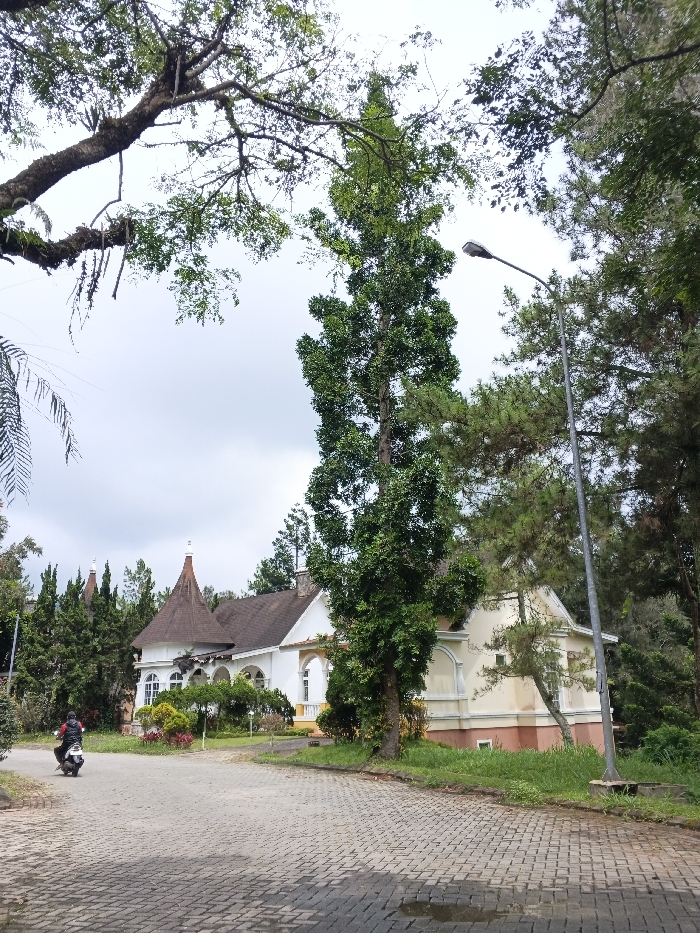 The scene depicts a paved, interlocking brick roadway winding past a white and cream-colored building with a brown pitched roof and a prominent conical tower. The building features arched windows and doorways, with well-maintained shrubs and small trees in its immediate vicinity. A single individual on a dark-colored scooter or motorcycle travels away from the viewer on the left side of the road. Tall, slender trees with dense green foliage stand along the road and in front of the building, alongside a grey streetlight pole. Large, gnarled tree branches, possibly moss-covered, extend into the upper left foreground, contrasting with the overcast sky. The overall environment is lush with various trees and grassy areas surrounding the structures. This location is identified as Unknown, Vietnam.