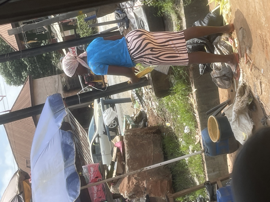 The image depicts a busy outdoor street scene in Oba-Aboji, Nigeria, under bright daylight. **People**: A person, likely female, is positioned in the mid-right foreground, viewed from behind. She wears a light-colored head wrap, a light blue short-sleeved top with a subtle pattern, and a light-colored, fitted skirt with dark, wavy horizontal stripes. She is wearing reddish-brown open-toed sandals. Her left hand holds one or two yellow corn cobs. Distant, blurred figures are visible on the street in the background. **Objects**: In the left foreground, a faded light blue market umbrella is open. Below it, several objects are visible: cardboard boxes (one labeled "Tru-Cape"), a large, irregular brown rock or concrete block, two plastic jerrycans (one blue, one dark blue), and a yellow plastic basin. A dark vertical pole, possibly a utility pole or market structure support, stands near the main subject. In the background, a light-colored sedan (possibly gold or beige) with black trim is visible on a paved road. Buildings with light-colored walls and reddish-brown corrugated metal roofs are present behind the road. **Environment**: The ground in the foreground and midground is primarily bare earth with patches of sparse green grass. There is a significant amount of litter and debris scattered across the ground, including black and white plastic bags and discarded corn husks. Green tree foliage is visible above and behind the buildings in the background. The sky is bright, appearing hazy or partly cloudy.