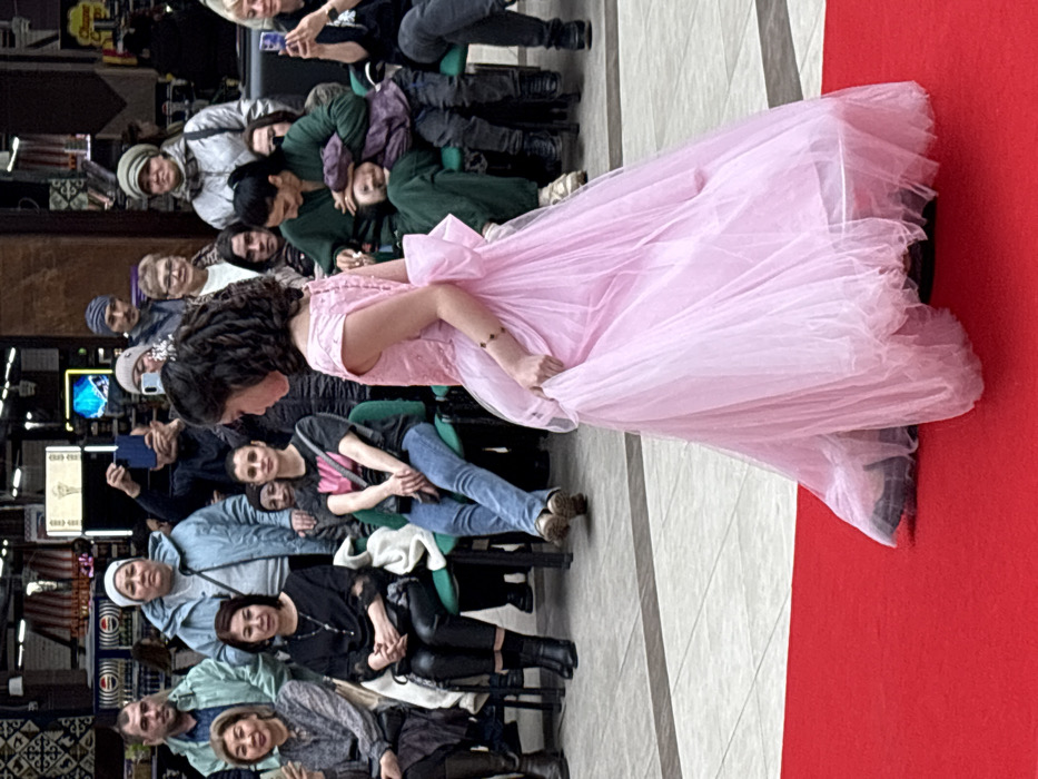 An indoor scene in a commercial building in Petropavl, Kazakhstan, depicts a young girl walking on a red carpet while observed by an audience