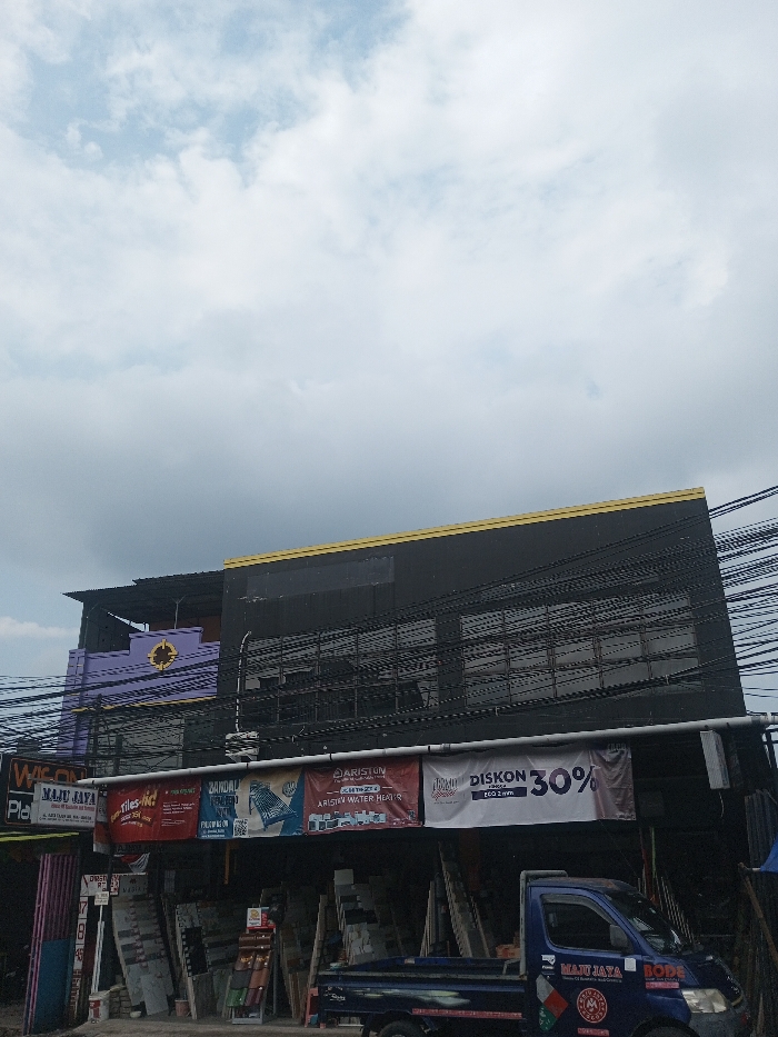 A two-story building with a black facade and yellow trim is seen under a cloudy sky. The second story has windows and power lines crisscrossing in front. Beneath the building are various businesses with signs for "VICON," "MAJU JAYA," "Tiles-lic," "BANDAL," and "ARISTON," advertising tiles, water heaters, and a 30% discount. A blue truck with "MAJU JAYA" branding is parked in front, suggesting a construction or home improvement supply store. A purple building with a sunflower emblem peeks out to the left.