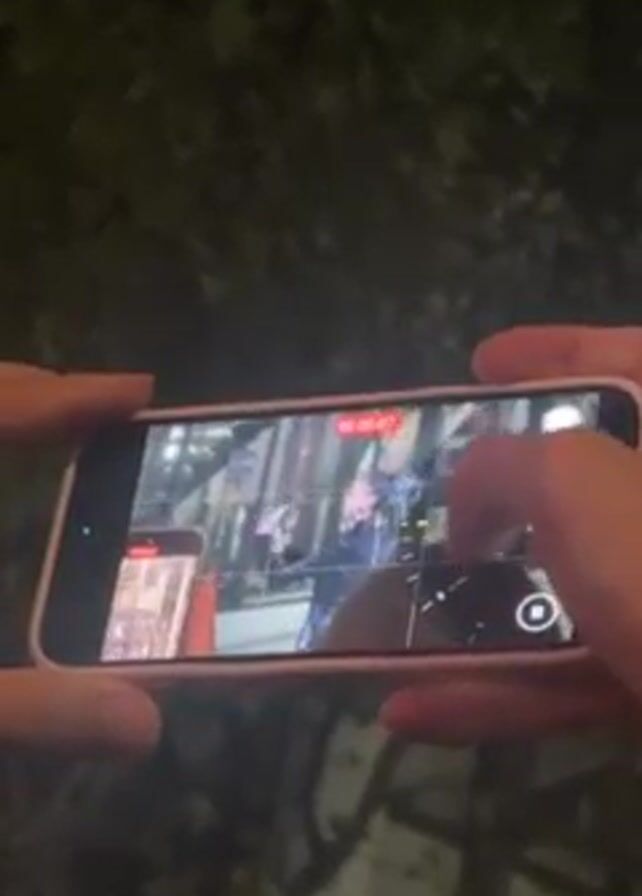 A person is holding a phone, recording video of individuals walking on a street. The person manipulates the phone screen, presumably adjusting focus or zoom. The environment appears to be an urban setting with greenery in the background. The recording subject walks in front of metal bars.