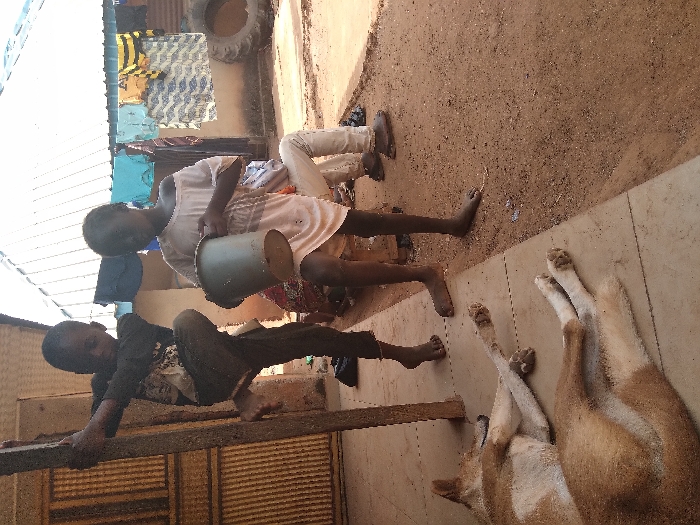 In Godogodo, Nigeria, an outdoor scene depicts two barefoot children and a resting dog