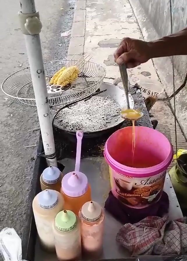 A man is preparing street food on a cart next to a sidewalk. He is stirring something in a pink bucket with a spoon and cooking strands of something in a large pan of hot oil. A corn on the cob sits in a wire basket to the side of the pan. A tray on the cart holds multiple bottles of sauces and condiments. A green stool sits on the sidewalk in the background.