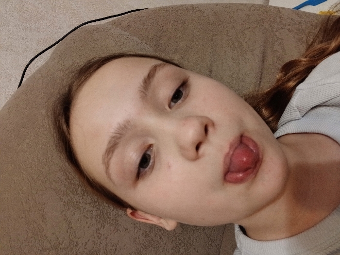 A young girl lies on a beige textured couch with her head tilted. She's sticking out her tongue, and her face is directed towards the camera. She has light skin, light brown hair, and neutral facial expression. A black cord runs along the top left of the couch. She wears a light-colored top.
