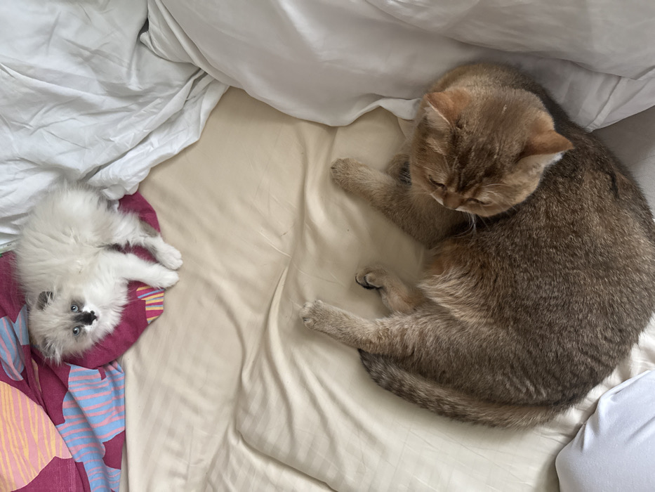 This image depicts an indoor domestic scene within the city of Yekaterinburg, Russia, featuring two cats on a bed